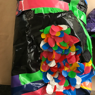 On bistro tabletops, were Fashion Designer templates for teens to create their own outfit! As the crowd grew, one teen handed me a sketch of her fashion template. I smiled and before I knew it I said the magic phrase, “let me get my design team”. With wide eyes and a ton of energy. Teen Club members rushed the tables and were ready to create. With a little assistance, the teens started wrapping another teenager in duct tape in angles that represented the fashion template we received. Soon, our first masterpiece was done. Several O-M-Gs later, we had ourselves a line and a crowd of teen volunteers to follow. This was a hit!